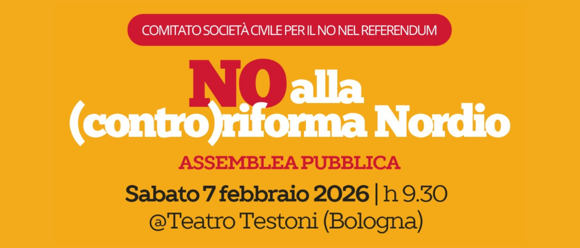 Sabato 7 febbraio, dalle 9.30 al Teatro Testoni di Bologna (via Matteotti 16) si terrà la prima assemblea pubblica del Comitato bolognese Società Civile per il No nel Referendum. Vi aspettiamo per l’evento di inaugurazione della campagna referendaria, sarà una mattinata di cultura e impegno civile. Di seguito, e nella locandina allegata, il programma e gli ospiti della mattinata.