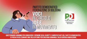 “Voci in circolo, idee in movimento” è un percorso di ascolto promosso dal Partito Democratico di Bologna per raccogliere opinioni, priorità, bisogni e proposte di iscritti e simpatizzanti. Il questionario, anonimo, è pensato per aiutarci a conoscere meglio chi partecipa alla vita del partito, capire quali temi sono considerati più urgenti e individuare modi concreti per rafforzare il ruolo dei circoli come luoghi di confronto, partecipazione e iniziativa sul territorio.