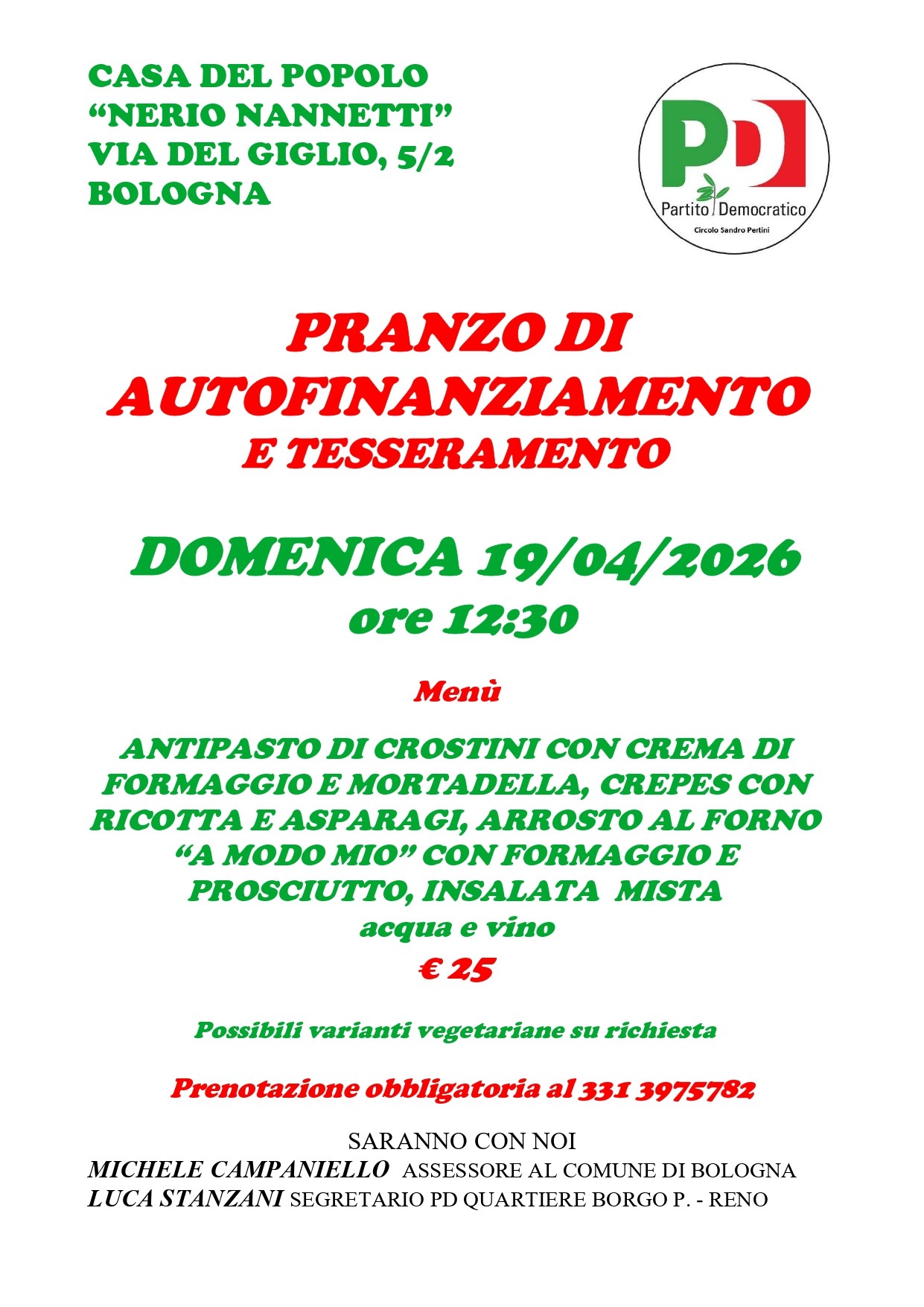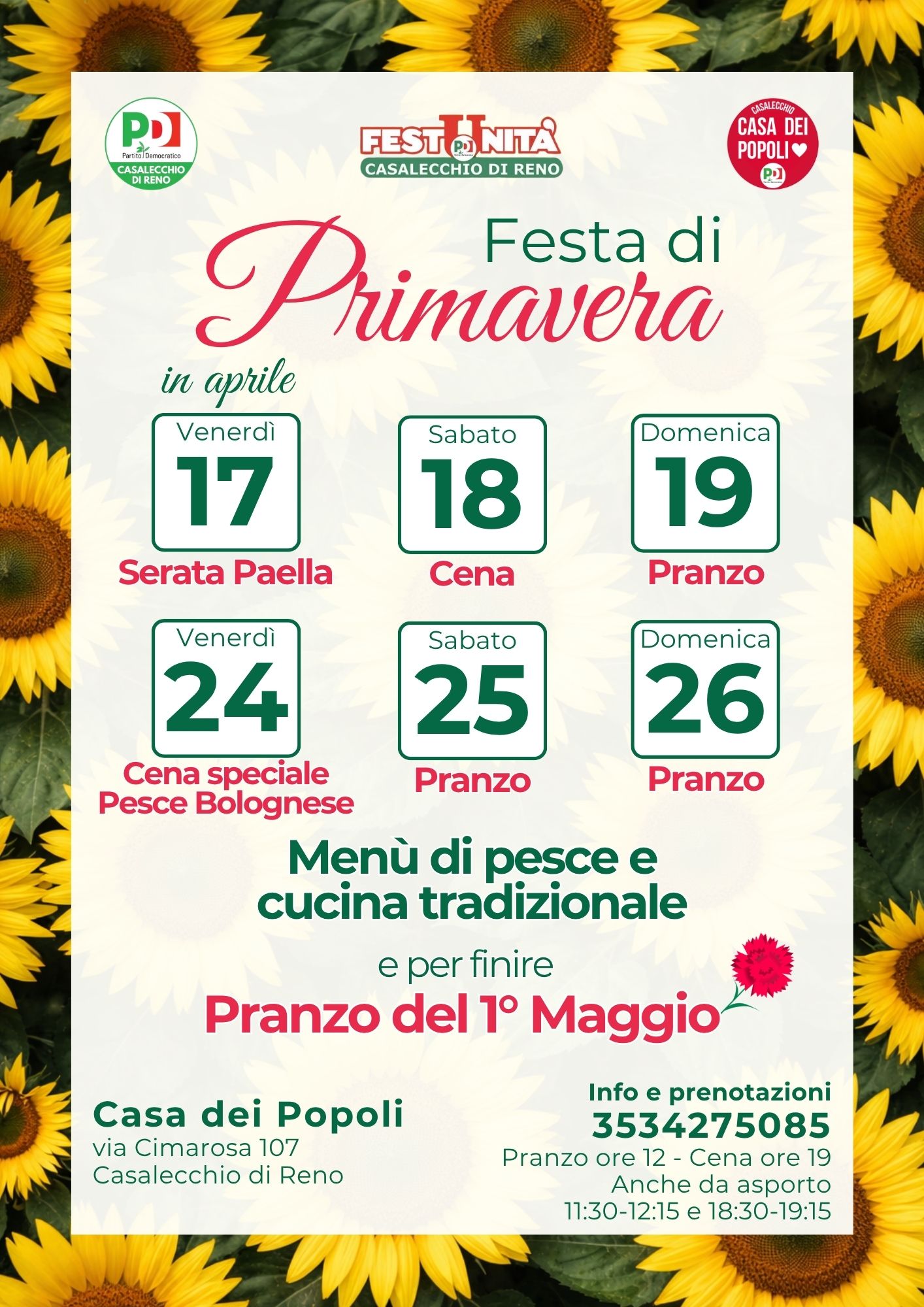 Feste dell’Unità Pranzo insieme (Festa della Donna)Domenica 8 marzo, ore 12 (ritrovo/servizio dalle 11.30) Boccodromo di Calcara – Sala Franco Magni – Valsamoggia Pranzo sociale per la Giornata internazionale della donna con menù fisso tradizionale e possibilità di menù da asporto. Pranzo della mimosaDomenica 8 marzo, ore 12.30 Centro feste Ivo degli Esposti – via dei Bersaglieri 7, Osteria Nuova – Calderara Un momento conviviale per stare insieme e celebrare l’8 marzo come giornata di comunità e partecipazione. Festa dell'Unità di MinerbioNei giorni 14 – 15 e 21 – 22 Febbraio Centro Feste Minerbio, via Caduti di Cefalonia 5 Tradizionale sagra del pesce Festa Unità al BattiferroNei giorni 14 e 15 Febbraio Sede Unione Navile, via Battiferro 2 Tradizionale sagra del pesce